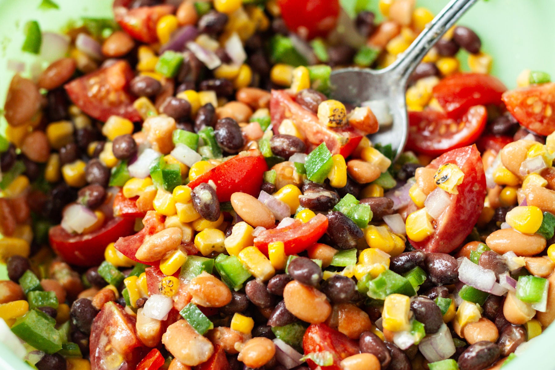 - Tastes great! This simple recipe lets the veggies shine, and is pulled together with an easy homemade dressing designed to bring some zing to this salad, thanks jalapeno lime dressing! Canned pinto and black beans, along with corn, form the base of this salad, to which I recommend adding diced red onion, bell pepper, and jalapeno. And most definitely mix in fresh tomatoes!