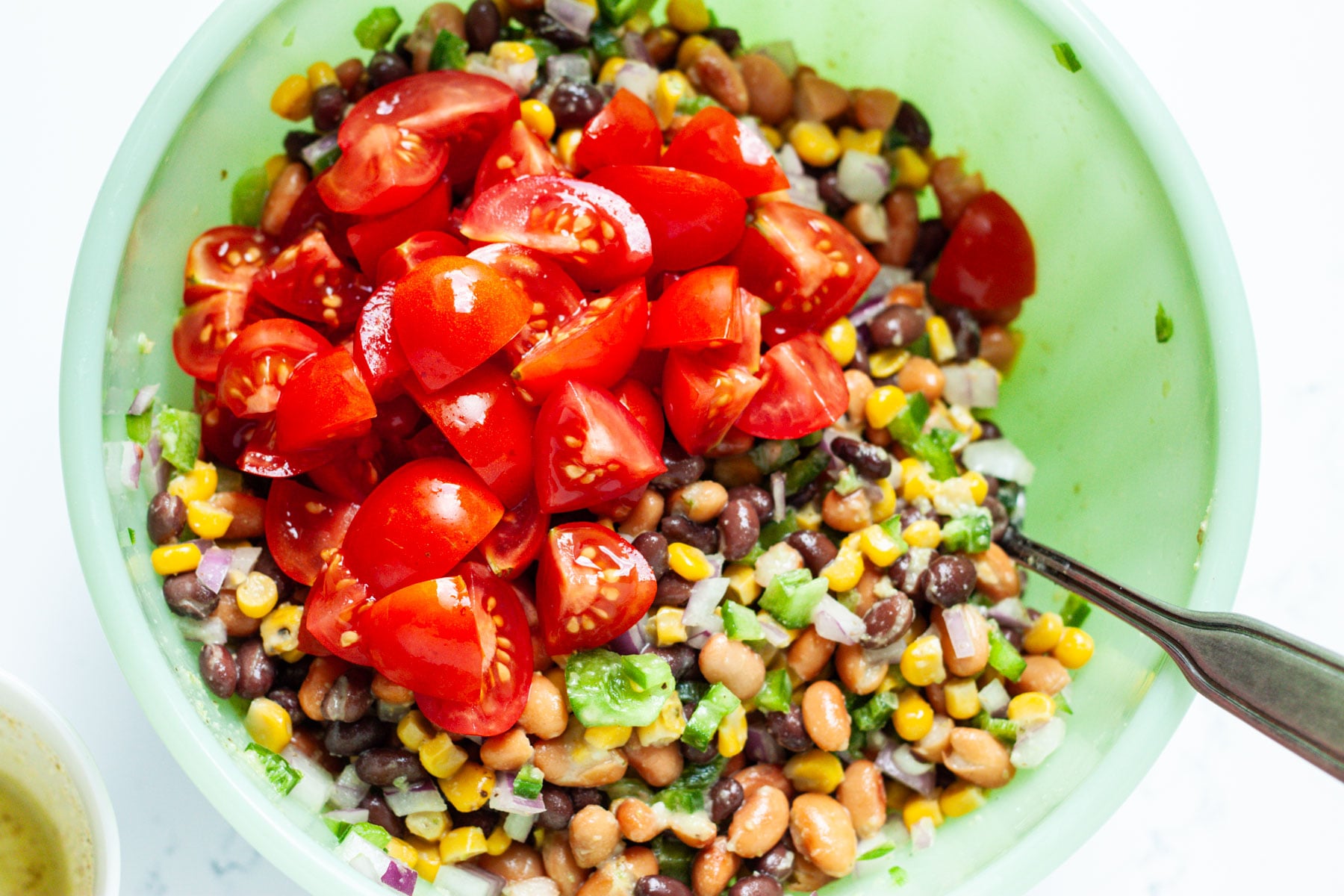 - Step 2: Uniformly dice the peppers, onion, and jalapeno, and drain the corn and beans. Halve or quarter the cherry tomatoes, depending on size. Add all ingredients to a bowl (EXCEPT tomatoes), including dressing.
